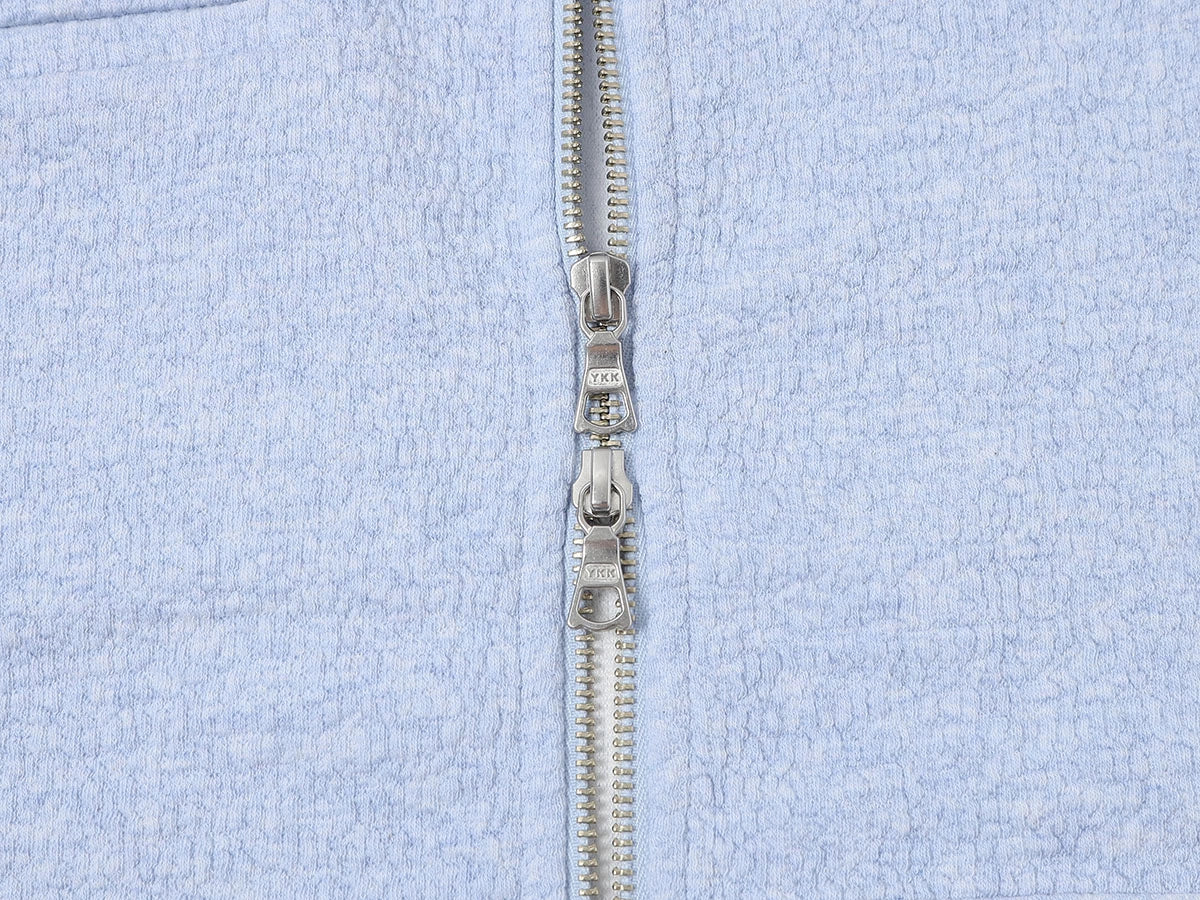 Boxy loose fit, textured fabric, neither too thick nor too thin, perfect for spring and autumn wear. The evenly distributed bubble-like texture on the surface enhances the visual appeal. The fabric is soft and comfortable to the touch, while its unique structure ensures a crisp and well-defined silhouette.