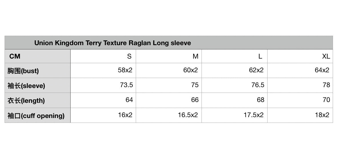 Premium terry-textured fabric, medium weight, exceptionally soft and fluffy to the touch. Features an excellent cut with strong drape, raglan sleeves, and slightly wide, non-ribbed cuffs for a relaxed, unrestricted feel. The fabric has been pre-washed to minimize shrinkage and maintain its shape