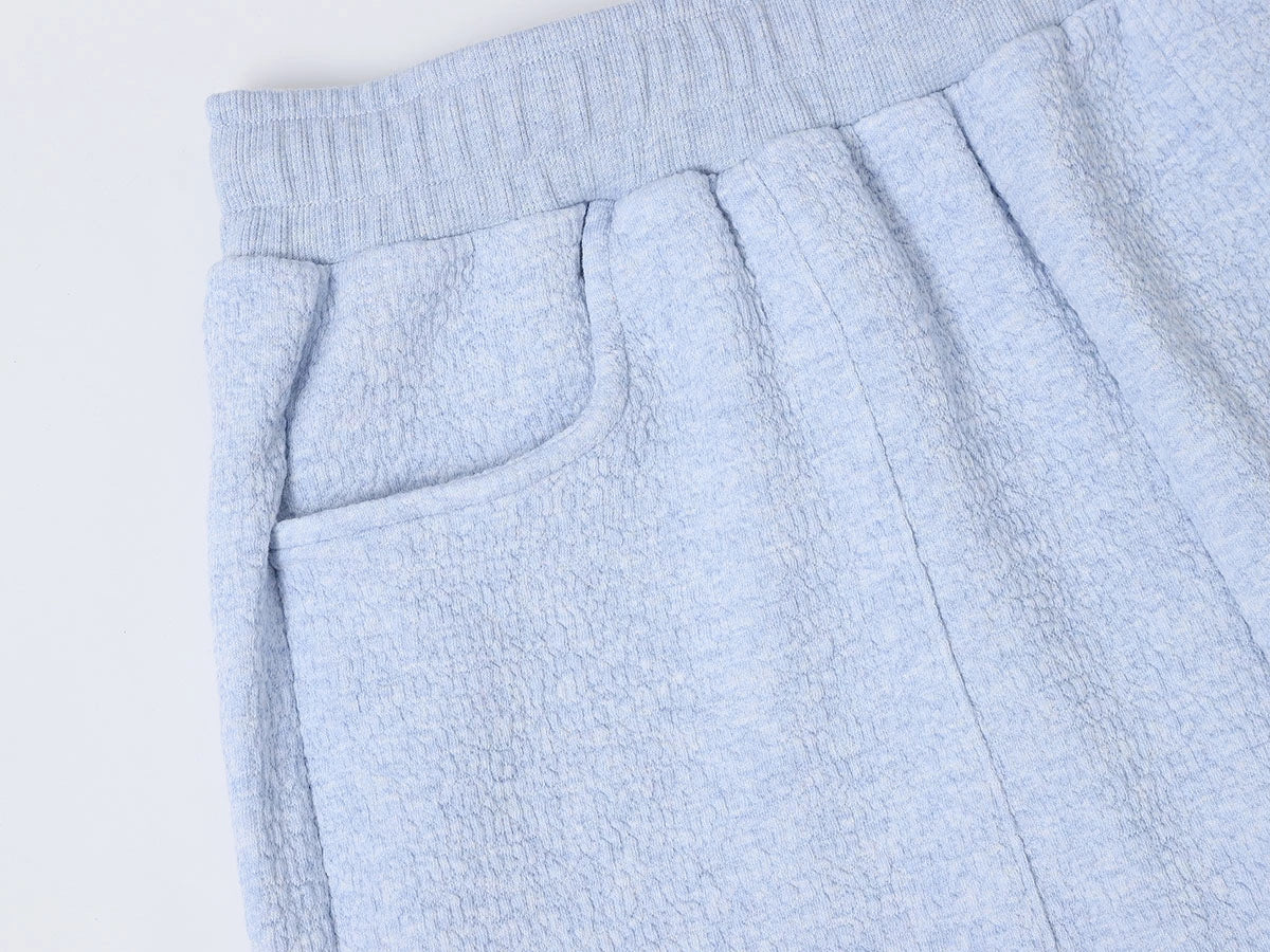 Oversized relaxed fit with elastic waistband,a luxuriously soft and substantial handfeel, textured fabric, neither too thick nor too thin, perfect for spring and autumn wear. The evenly distributed bubble-like texture on the surface enhances the visual appeal. The fabric is soft and comfortable to the touch, while its unique structure ensures a crisp and well-defined silhouette.