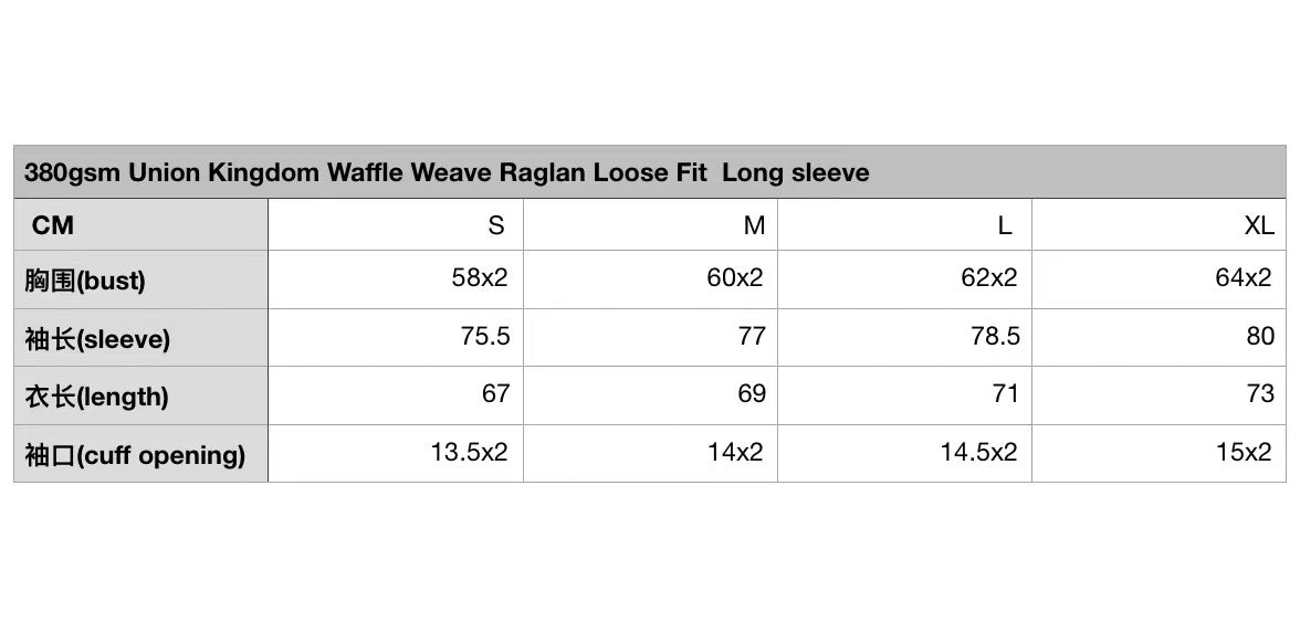 Made from pure cotton waffle fabric, it's soft and skin-friendly with an excellent cut and strong drape. The raglan sleeves are slightly wide without ribbed cuffs, offering a relaxed and unrestricted fit. The fabric has been pre-washed to prevent shrinking and maintain its shape.