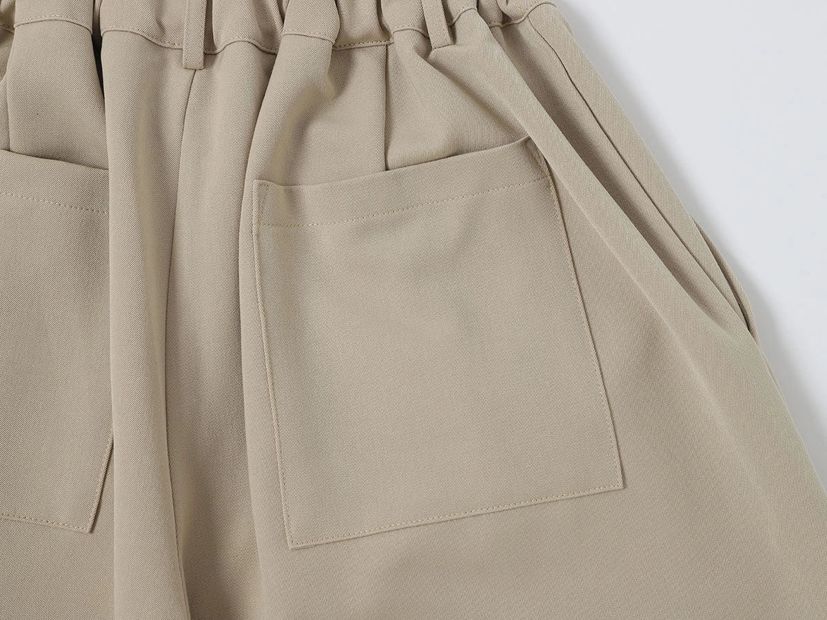 Casual pants fabric, offering a smooth drape and a structured silhouette with a relaxed fit.
